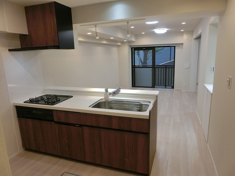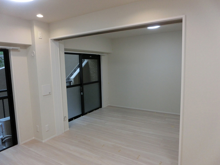 クローゼットを増やしたため変形して使いずらかった洋室を含め、全体的にプランを見直しました。洗面所、浴室、トイレも雁行していた配置を整理しシンプルな動線とすることにより、使い勝手が向上しました。LDKと洋室の間仕切りに3枚引込戸を採用し、開放時にはLDKと洋室を大きな空間として一体的な利用ができるよう間取りに可変性を持たせました。