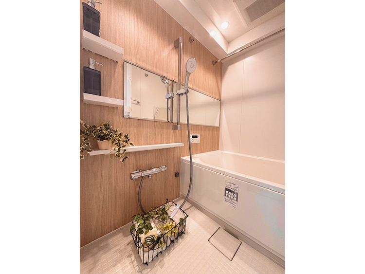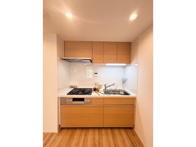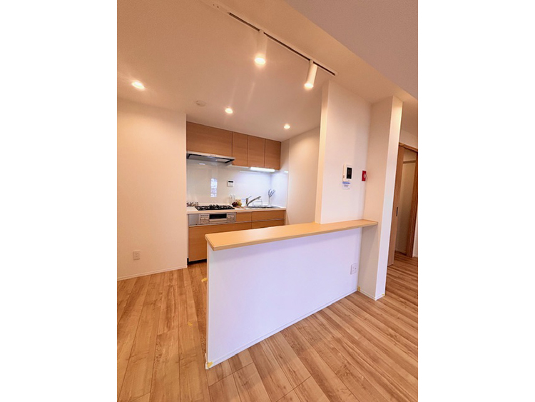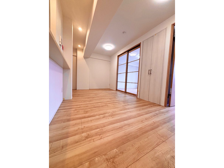 玄関から入室すると直接LDKに入っていた2LDKのプランをプライバシーに配慮した廊下を備えたプランに変更しました。水回りスペースに洗濯機置場が無かったプランを見直し、LDKから利用できる位置に扉を設けた洗濯機スペースを設置しました。LDKと洋室の間仕切りには透明なアクリルパネルを使用した2枚引込戸を採用し、LDKへの採光を確保しながら開放時にはLDKと洋室を大きな空間として一体的に利用できるプランに変更しました。