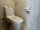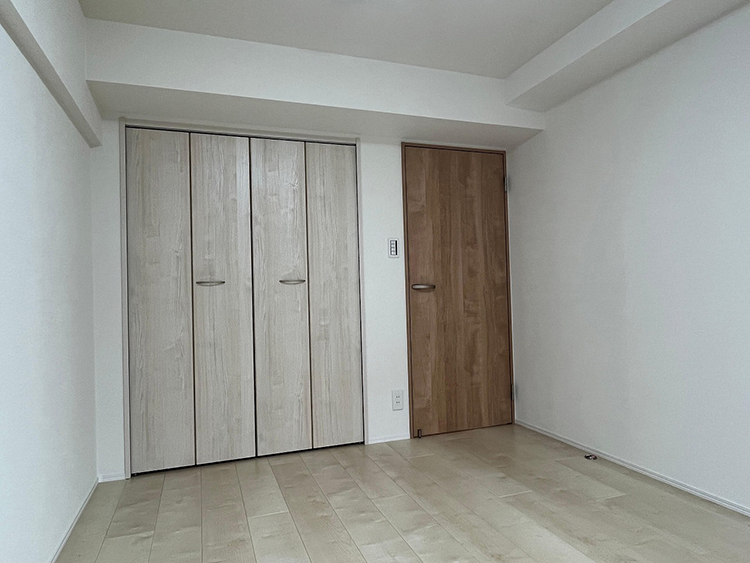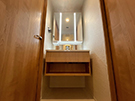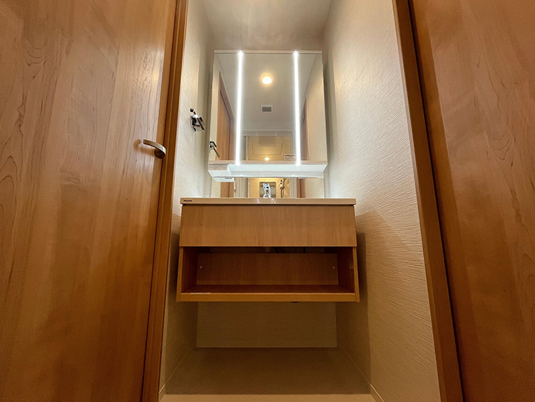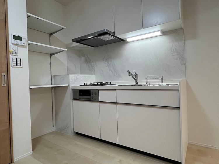 玄関から直接入っていた中部屋DKのプランを見直し、玄関ホールを計画したことによりプライバシーを確保した1LDKにしました。洗面と浴槽が同一空間にあった2点ユニットバスから洗面化粧台を独立させた洗面所を設けたことで水回りの使い勝手が良くなりました。LDKのフローリングとキッチンの面材色をホワイト系で統一したことで明るく広がりのある空間に仕上がりました。