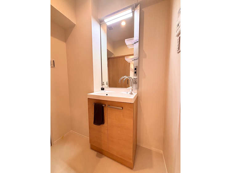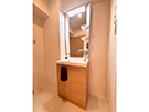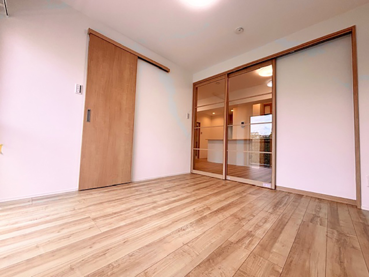 玄関から入室すると直接LDKに入っていた2LDKのプランをプライバシーに配慮した廊下を備えたプランに変更しました。水回りスペースに洗濯機置場が無かったプランを見直し、LDKから利用できる位置に扉を設けた洗濯機スペースを設置しました。LDKと洋室の間仕切りには透明なアクリルパネルを使用した2枚引込戸を採用し、LDKへの採光を確保しながら開放時にはLDKと洋室を大きな空間として一体的に利用できるプランに変更しました。