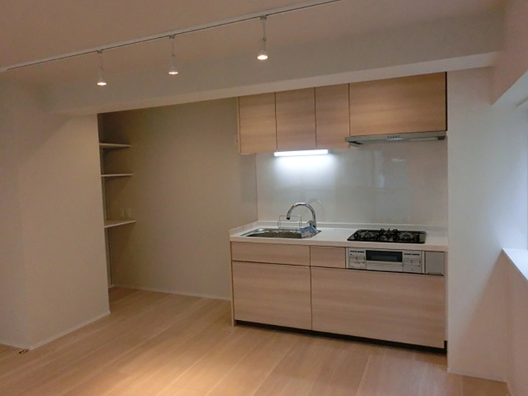 トイレと洗面化粧台が同じ空間にあった従来のプランを見直し、それぞれを独立させることでプライバシーを確保しました。手狭だった浴室のスペースを広げ、明るく衛生的なユニットバスに変更しました。LDKのフローリングとキッチンの面材はベージュ色で統一し、ナチュラルで広がりのある空間に仕上げました。