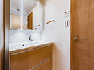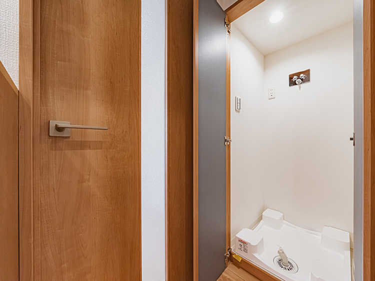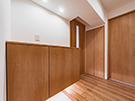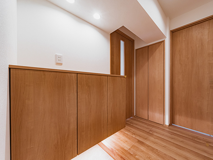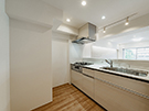 中部屋で採光が無かったLDKを持つ3LDKのプランを見直し、バルコニーに直接面し明るく開放的なLDKへ生まれ変わりました。LDKと洋室の間仕切りには3枚引き違い戸を採用し、開放時にはLDKと洋室を大きな空間として一体的に利用できるプランに変更しました。床材と室内建具をブラウン色で統一したことでまとまりのある落ち着いた空間に仕上がりました。