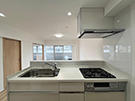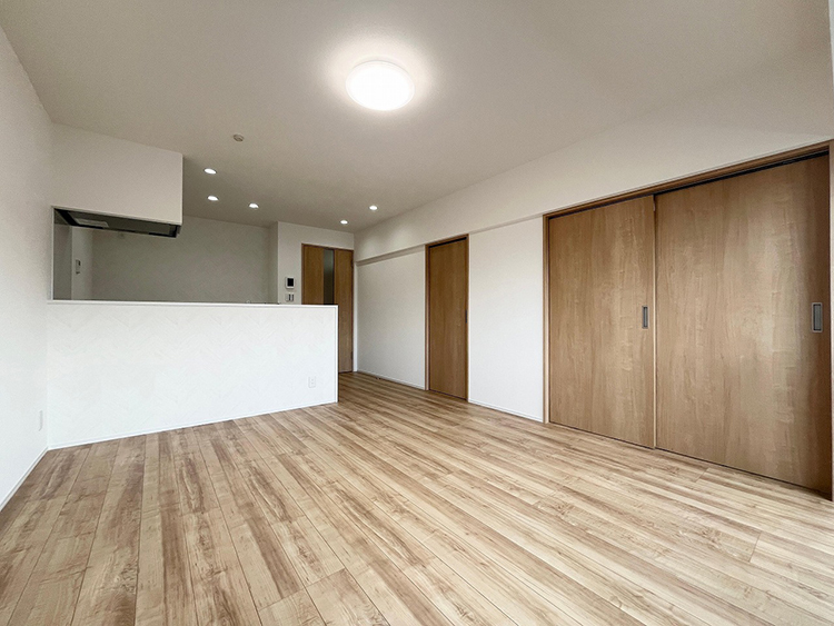 中部屋で採光が無く、キッチンとリビングダイニングが分離していた3LDKのプランを見直し、バルコニーに直接面した対面式キッチンを持つLDKにすることで明るく開放的な空間に生まれ変わりました。共用スペースに大型のウォークインクローゼットを設置し収納にも配慮しました。