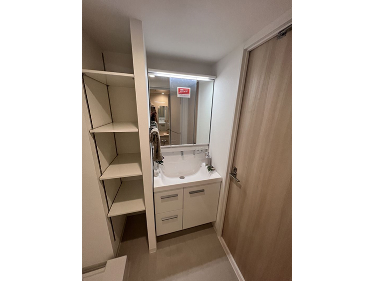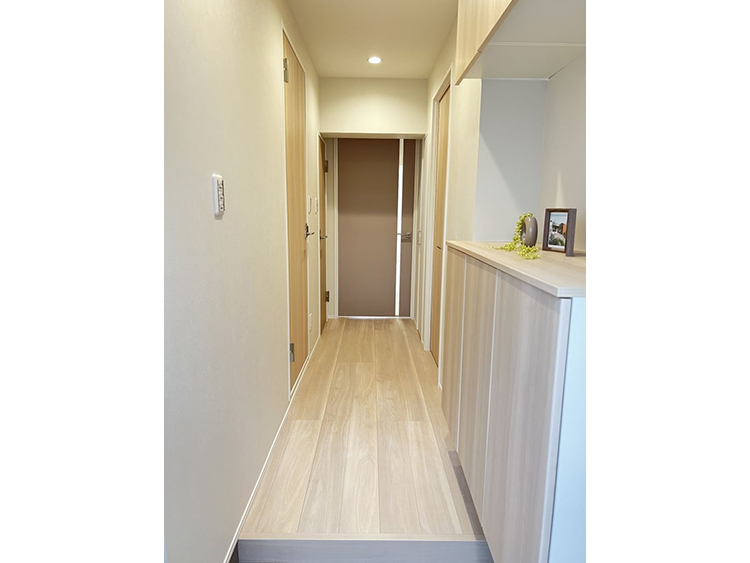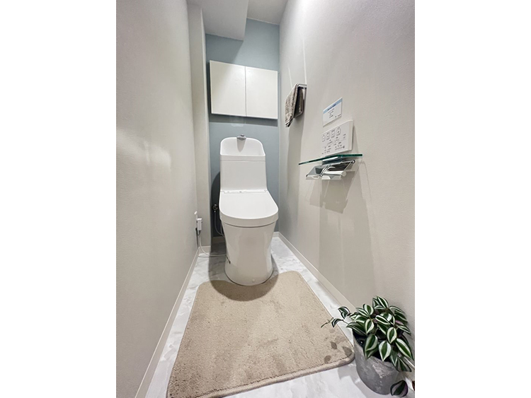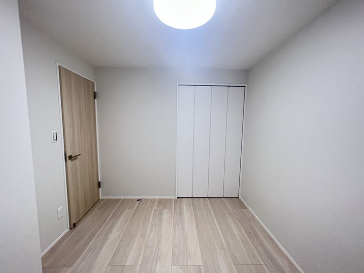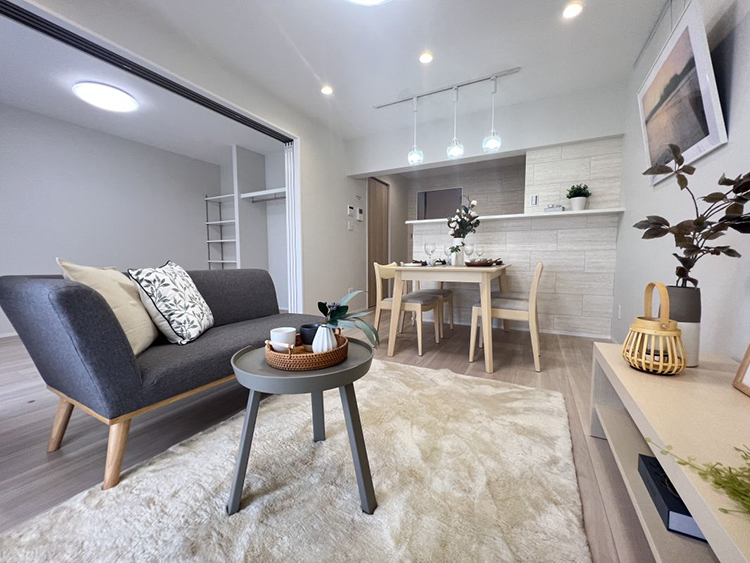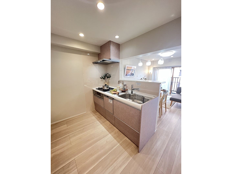 全体的に床材にはクルミ柄、建具をコウノキ柄と優しい色合いで作りつつ、アクセントとしてリビングへの建具にはソフトモーブを仕様し、可愛らしさもあるモダンなお部屋にしてみました。カウンターキッチンのカウンター下と調理スペースの背面クロスには同じ石目調を使用しており、統一して調和のとれた仕上がりになっています。
