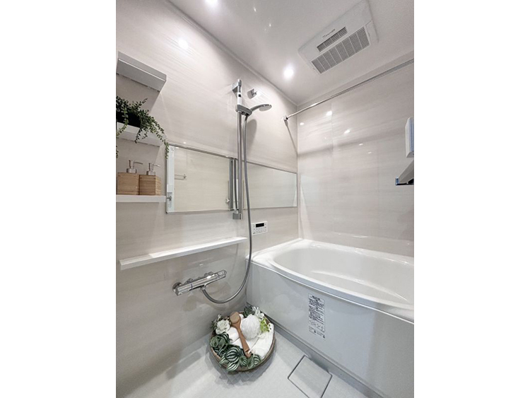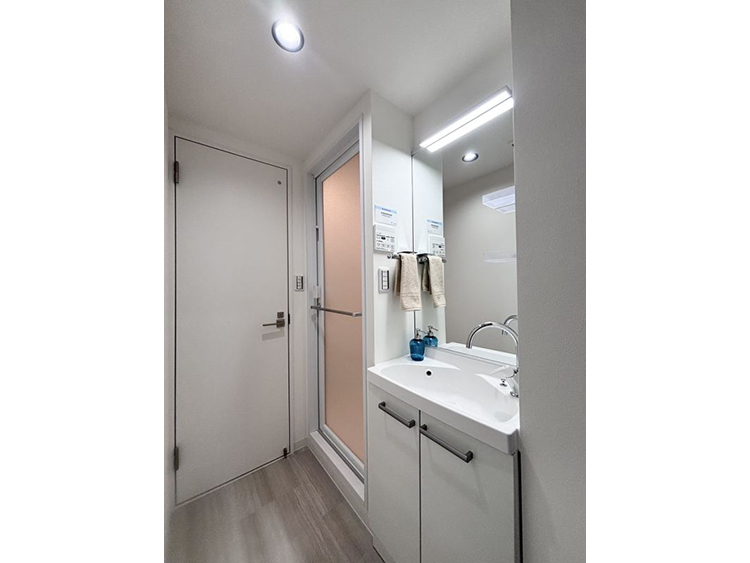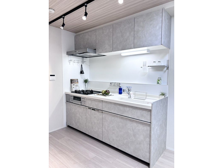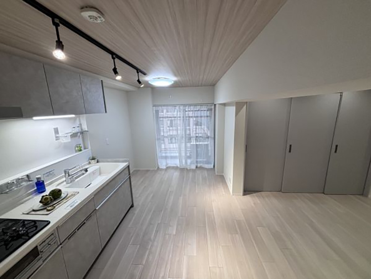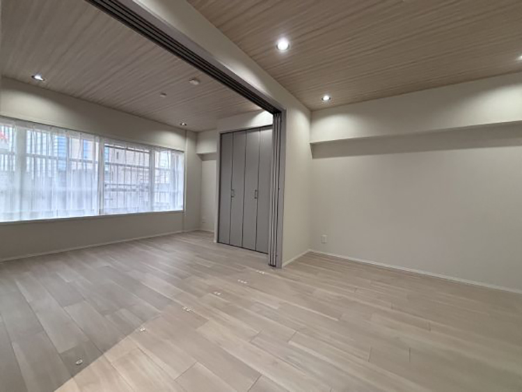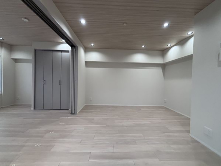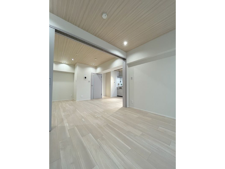 引き戸を開ければ、広々とした20帖以上のLDKの創り。閉めて6帖の洋室として、(明るい色味の建具のため閉めていても圧迫感なく自然な印象です)または開けてLDKの一部にと、スタイルに合わせてお住まいいただけます。LDK天井のクロスは淡い木目柄、フローリングと相まって優しい空間になっています。