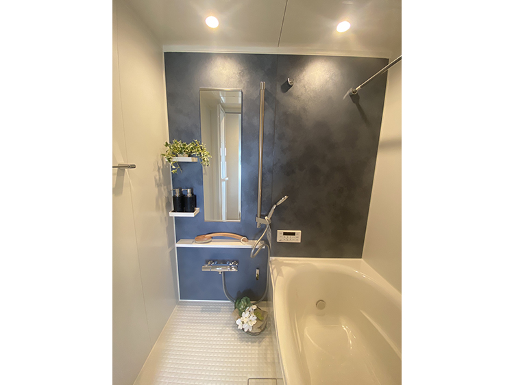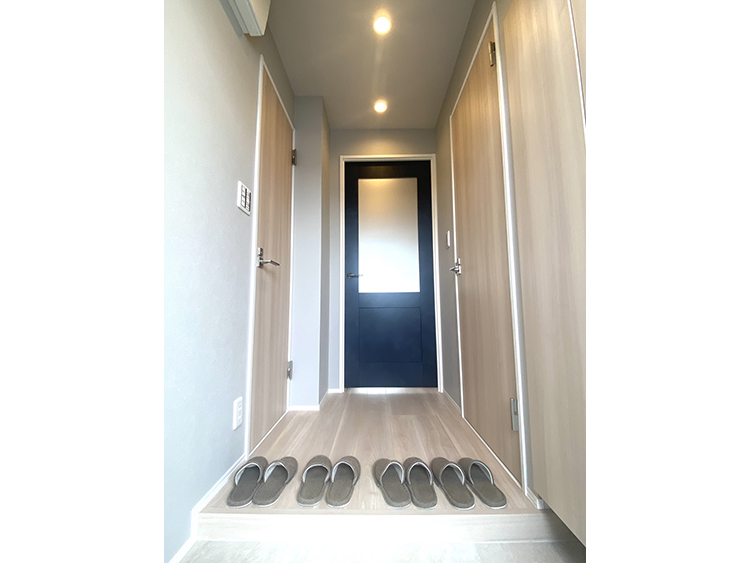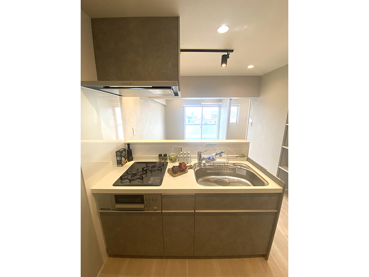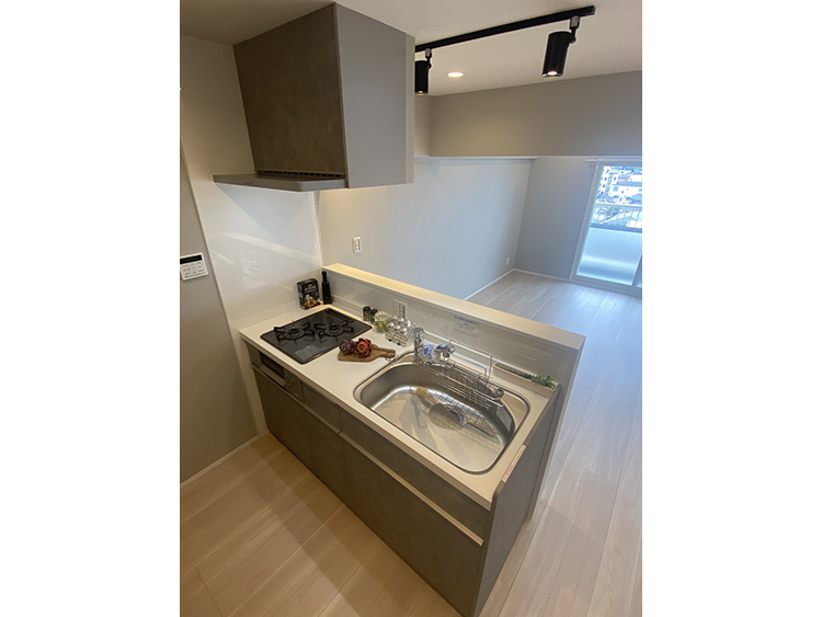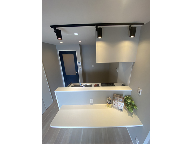 明大前に「シングル~DNKSライフに快適な間取り」をテーマにグレージュ系で統一したお部屋を作ってみました。廊下からこのお部屋を印象付けるコバルトブルーのリビングドアを開けると、カウンター付きのキッチンからも晴れた冬の朝は富士山を望め、一日の始まりを気持ちよくスタートさせてくれます。