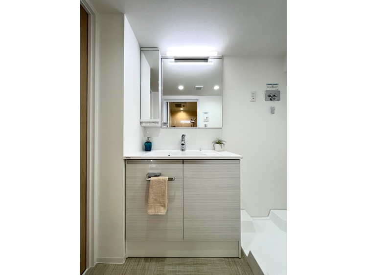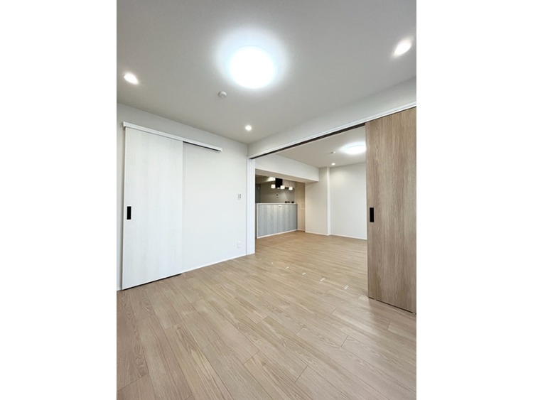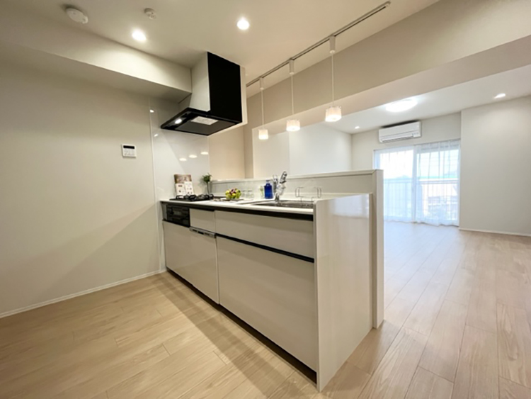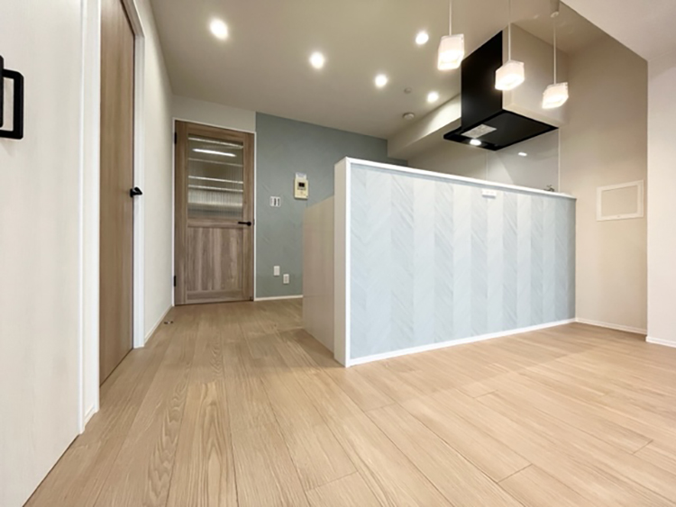 独立キッチンから開放的な対面式キッチンへ変更いたしました。L字型のリビングから、すっきりとしたスクエア型のリビングへ変更することにより、各洋室の広さを確保しながらウォークインクローゼットも設置することができました。