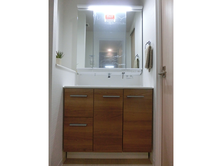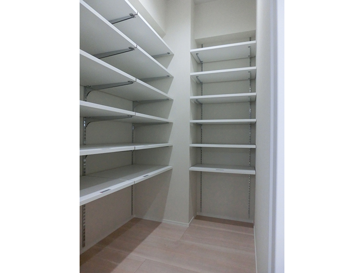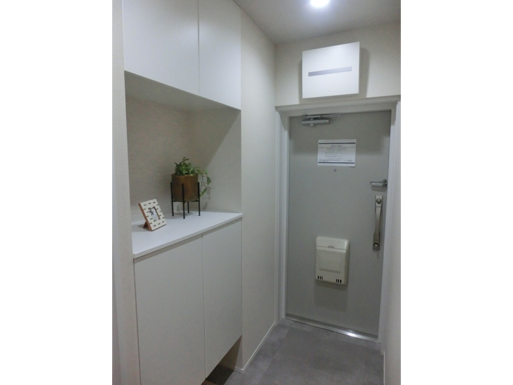 玄関を開けると、まず目に入る下駄箱を二の字にして上に写真や小物を置けるようにいたしました。リビング扉を開けると目の前が壁になってしまうので、ニッチカウンターを設置し、こちらも見せる場所としました。キッチン横にマルチ収納、各洋室へ大きめな収納を設置することにより、物が多い人でもしっかり隠せる収納スペースも確保いたしました。