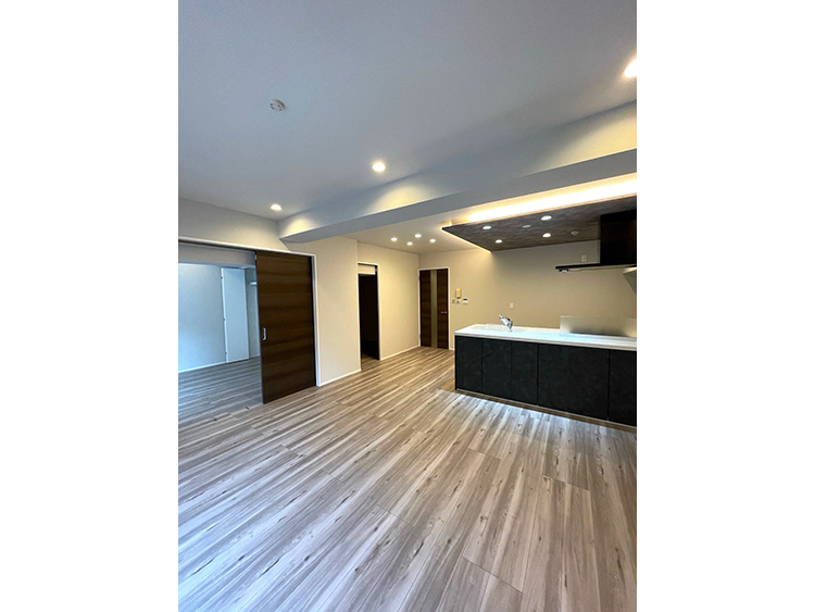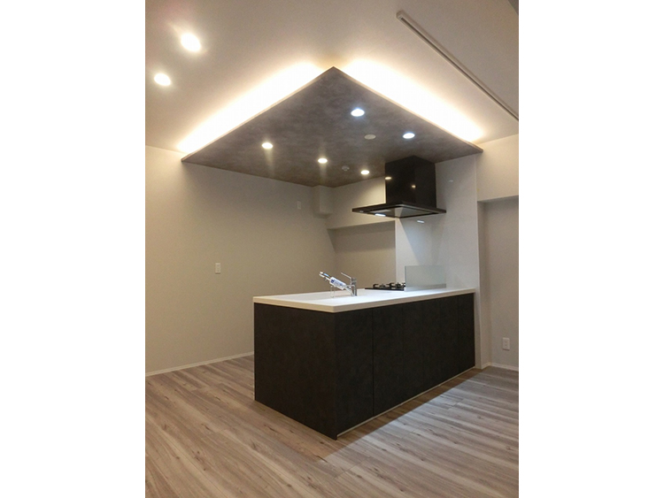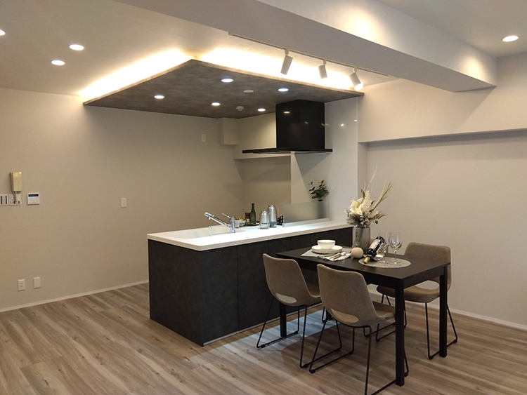 対面型システムキッチンにすることにより、開放的なリビング空間に設計し、さらにキッチンの天井に間接照明を取り入れることでデザイン性を持たせました。事務所としても使用可能で、隣の洋室の引き戸を全開すればL型の大空間としても使用することが出来ます。