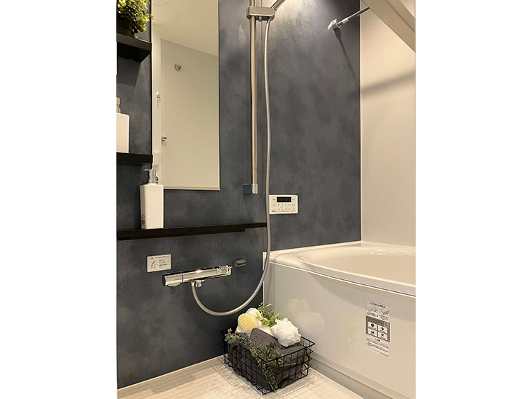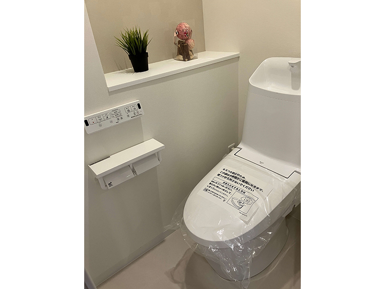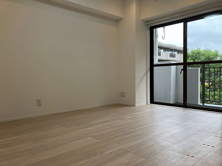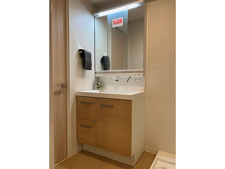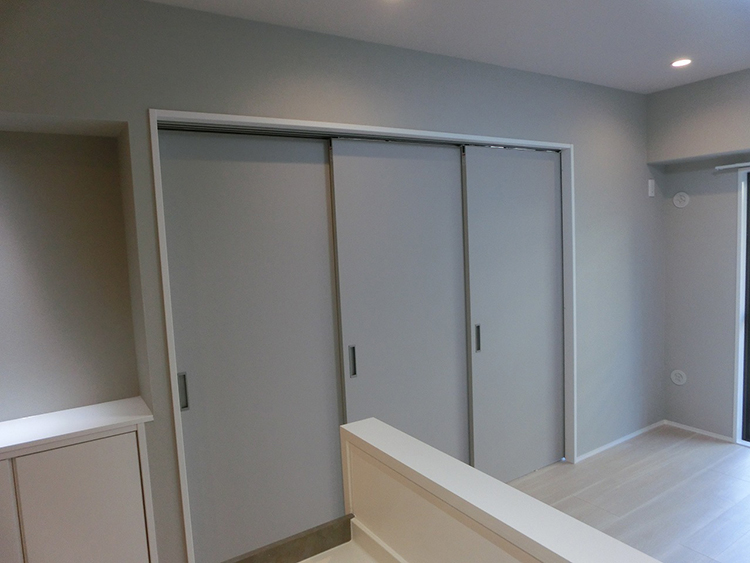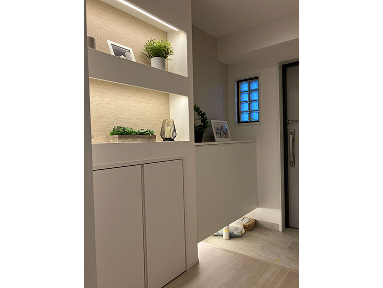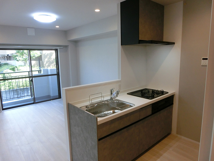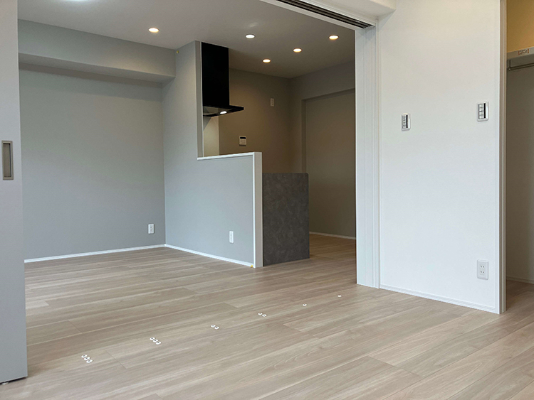 玄関スペースにゆとりを持たせ、シューズボックスの隣に飾り棚を設置しました。LDKは対面キッチンを採用し隣接する洋室との間を3枚引込戸にすることにより、解放時にはLDKとの一体感を持たせ解放的な空間をつくることができるようにしました。バルコニーは通路に面しているため日当り・眺望が良好です。