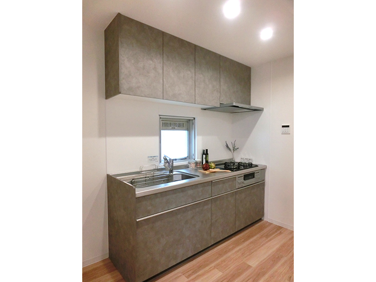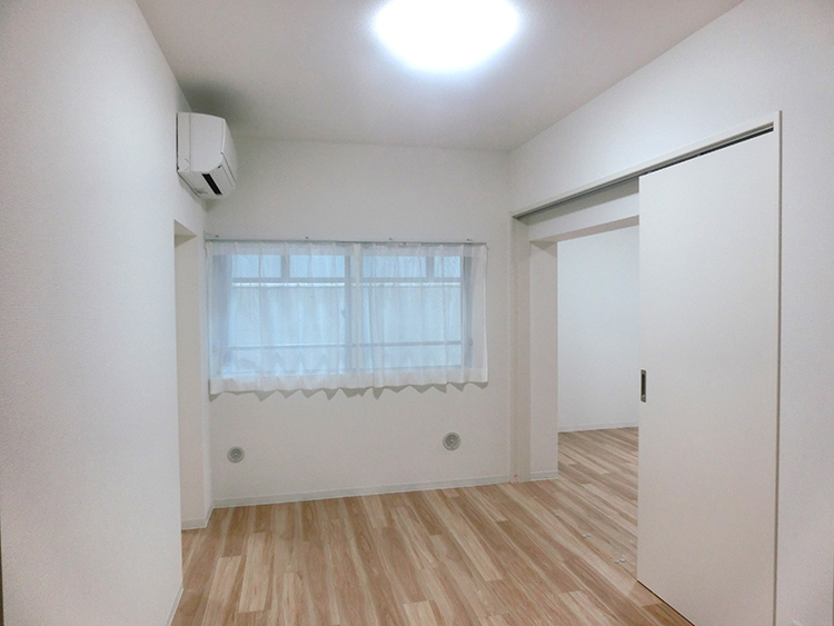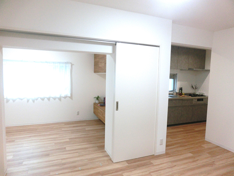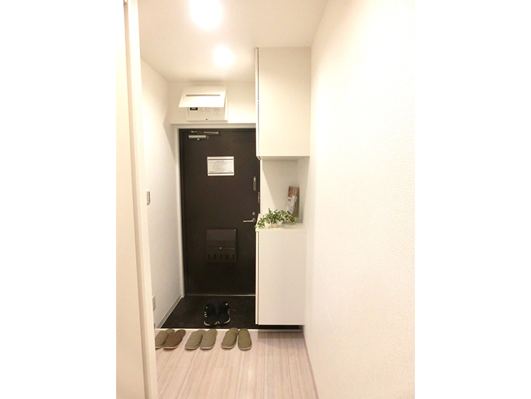 システム収納を設置することにより、収納問題を解決しました。フローリングは廊下に石目調を使用し、お部屋はナチュラル系を使用しました。天井、壁には白い壁紙を採用し、全体的に明るく空間に仕上げました。