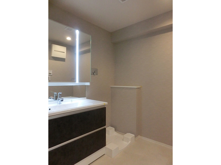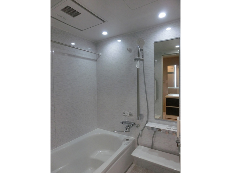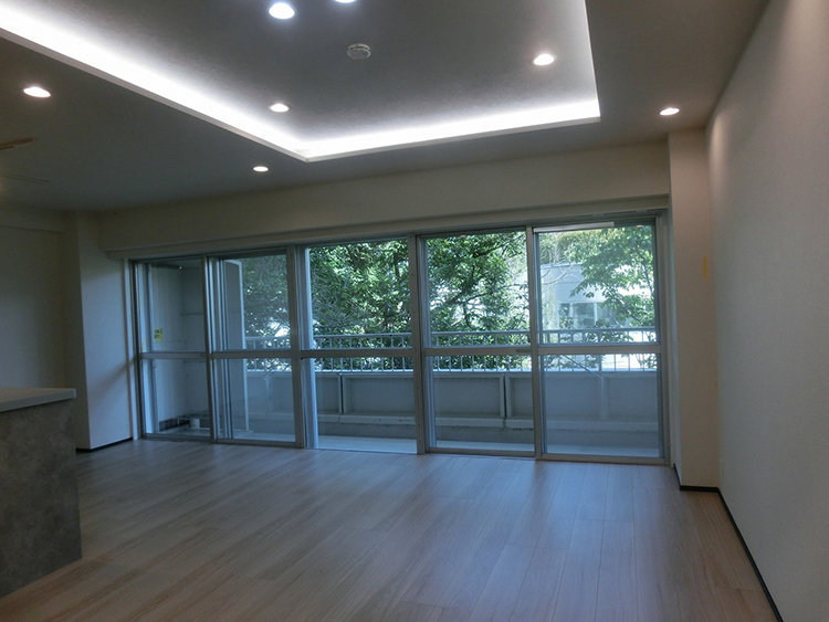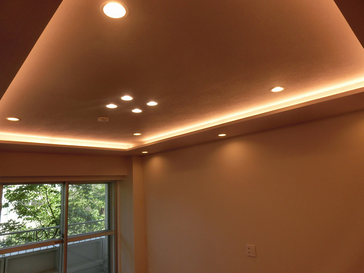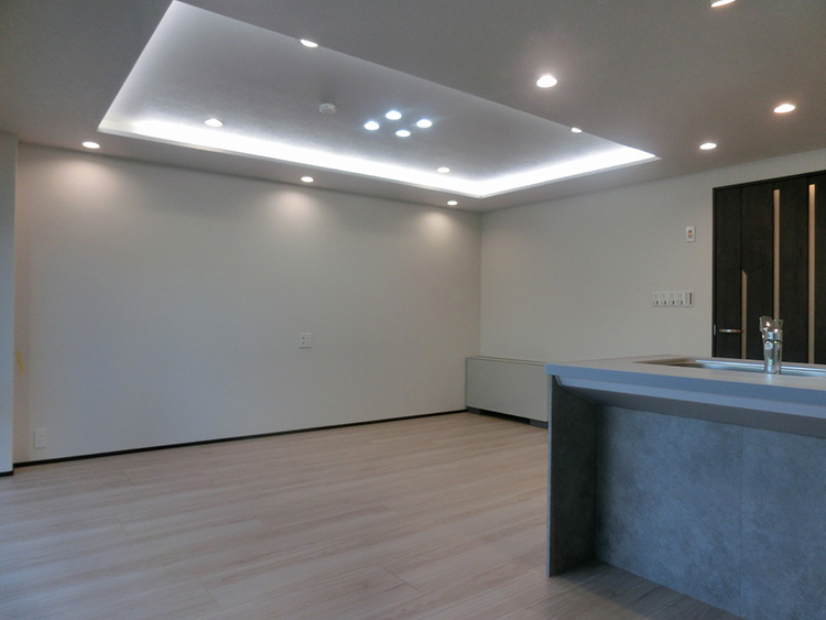 対面キッチンにすることにより、空間の一体感を高めました。リビングスペースの天井にコーブ照明を設置、調光調色機能のある照明にすることにより、シーンごとに色温度を変えてスタイリッシュな空間から温和な空間等、変化を楽しめる部屋にしました。